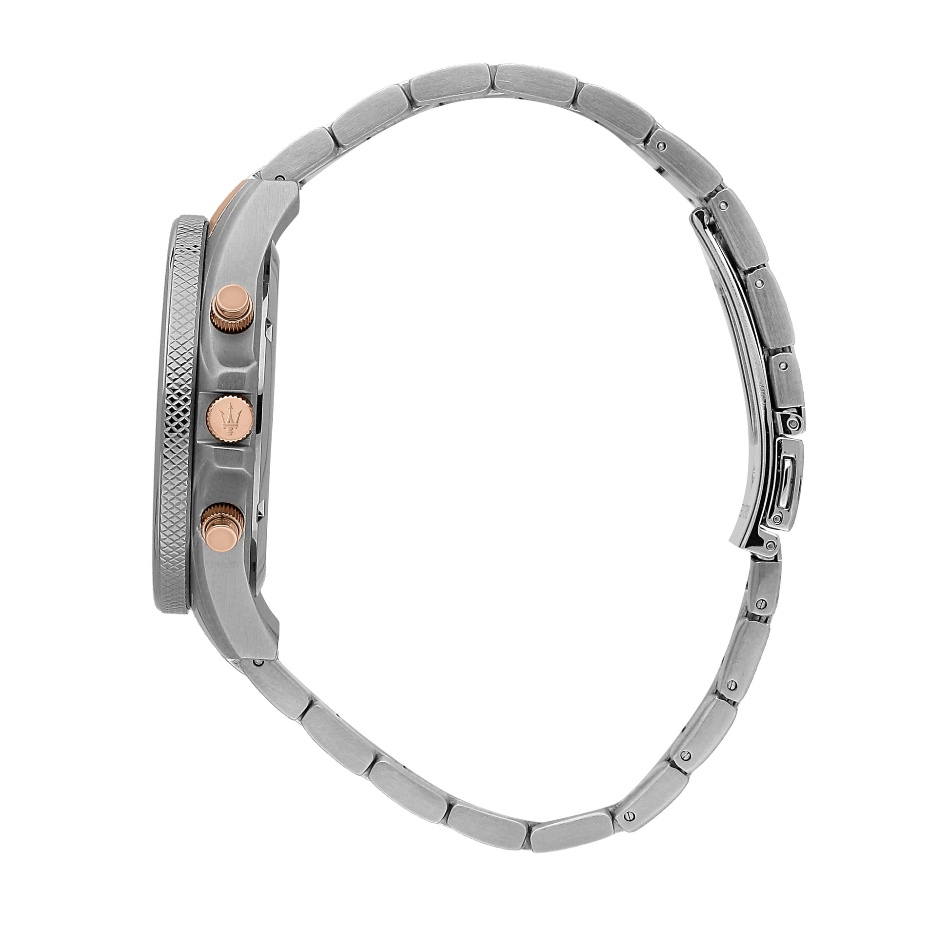 Elegant stainless steel watch is a great proposition for every man. The envelope and bracelet are made of high quality stainless steel in silver and pink -colored colors. The whole is complemented by a navy blue disc equipped with various amenities: date of the month of the month, chronograph, tachymeter and 24-hour time.
