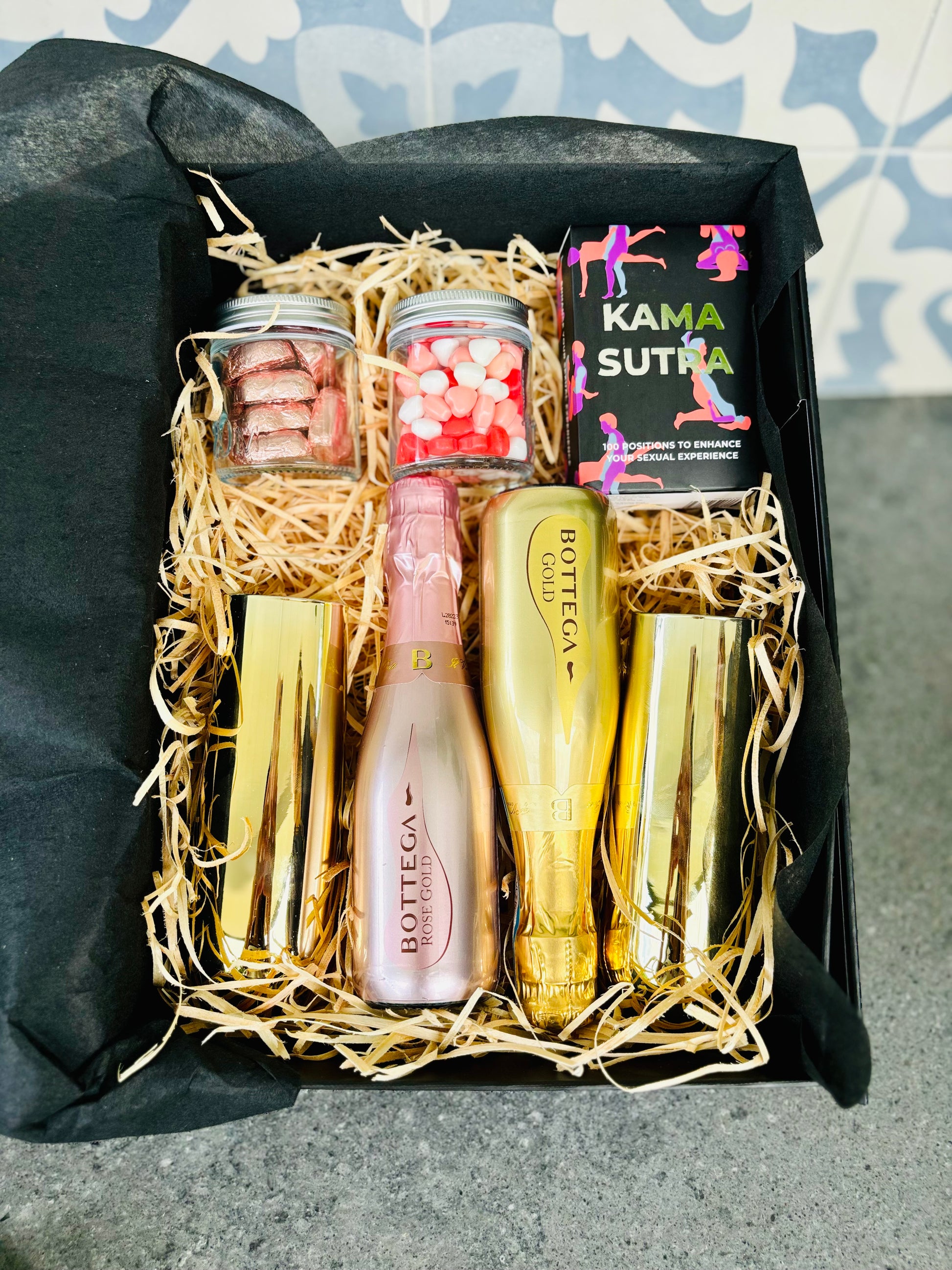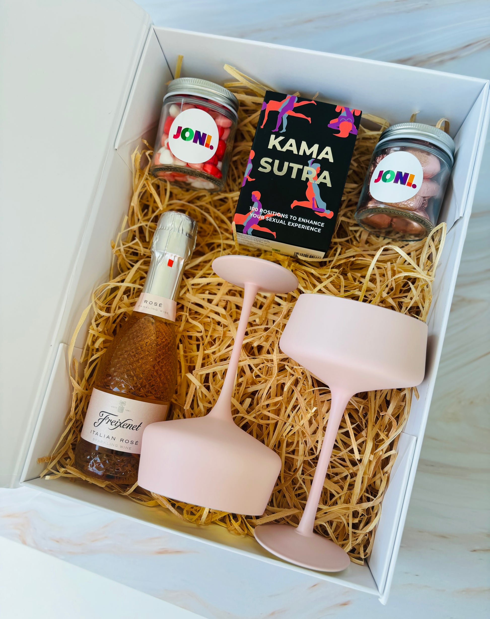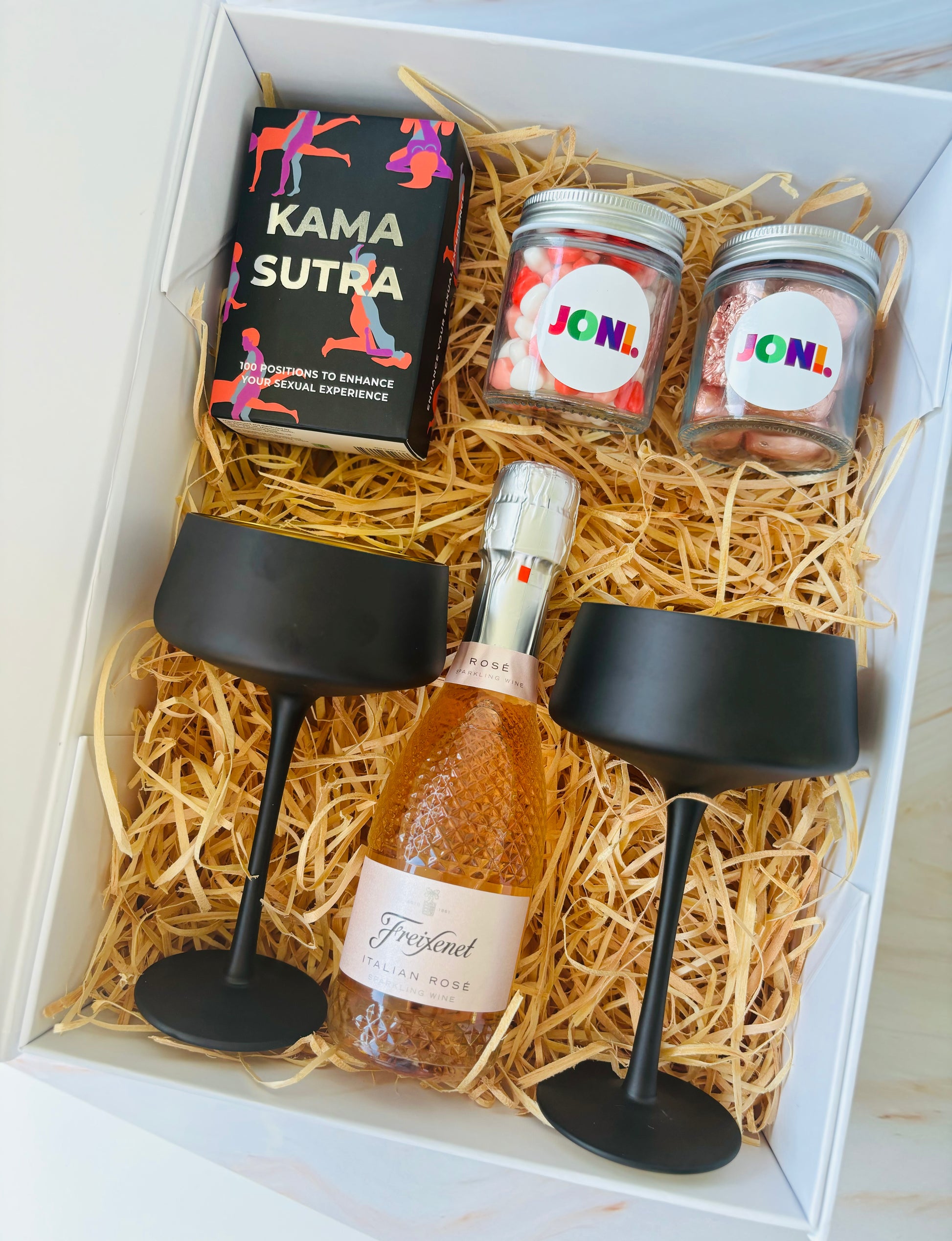 Introducing our alluring Naughty Gift Box - a tantalising blend of romance, sophistication, and playful intimacy. This curated set is designed to turn your celebration into an unforgettable journey with a bottle of prosecco, elegant glasses, and a set of Kama Sutra Cards. Elevate the mood and create a sensual experience that sparks connection and passion.