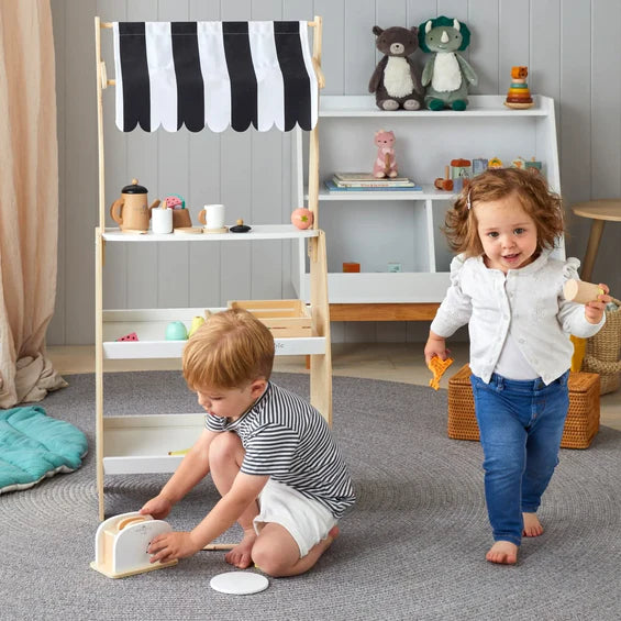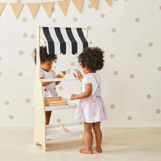 This versatile wooden market stall with awning is perfect for little ones to set up as a food market, lemonade stand, coffee shop or anything they can imagine!