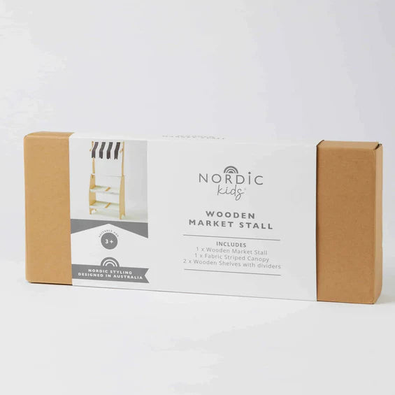 INCLUDES: 1 x Wooden Market Stall, 1 x Fabric Striped Canopy, 2 x Wooden Shelves with Dividers